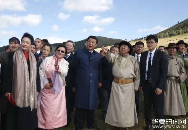 2014年8月,习近平主席和夫人彭丽媛访问蒙古国,时任蒙古国总统额勒贝格道尔吉和夫人陪同观看那达慕。