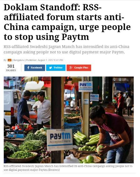 印度民族主义极端组织国民志愿团附属的右翼组织Swadeshi Jagran Manch号召抵制“印度版支付宝”,甚至还呼吁印度政府出于经济和安全原因禁止中国对相关公司进行投资。