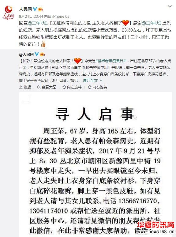人民网北京9月22日电 9月21日,居住在北京有老年痴呆症状的67岁老人周正荣早8:30从家中出走一直未归,全家人陷入了焦急的寻找之中。在人民网官方微博@人民网的传播及热心网友的爱心接力下,终于在当日23时30分左右找到了走失老人。