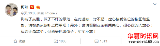 随后,何洁在微博发文致歉,说道:“影响了交通,做了不好的示范,在此道歉,对不起,虚心接受各位的指正和监督。请警察叔叔补上罚单吧!另外:也请看到这条新闻关心、担心我的人放心:我的手虽然小,但我会抓紧孩子,牢牢不放!”