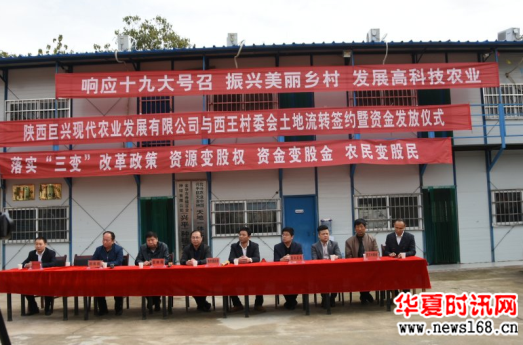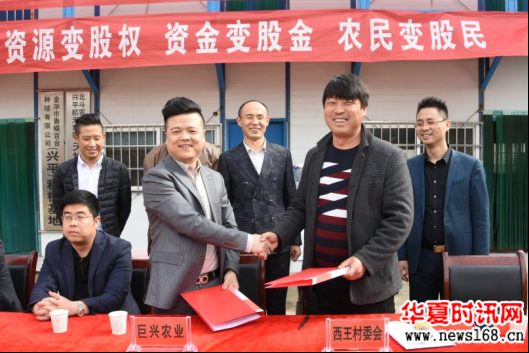 2017年11月10日,兴平市南市镇西王村村委会大院内锣鼓喧天,热闹非凡,陕西巨兴现代农业发展有限公司与西王村委会土地流转签约暨资金发放仪式正式举行,董事长杨航携董事会成员盖思宏、王永强、候永生、贾永刚亲临现场,兴平市政府、招商局、农林局、南市镇政府及西王村上百名村民见证了这一盛大时刻。