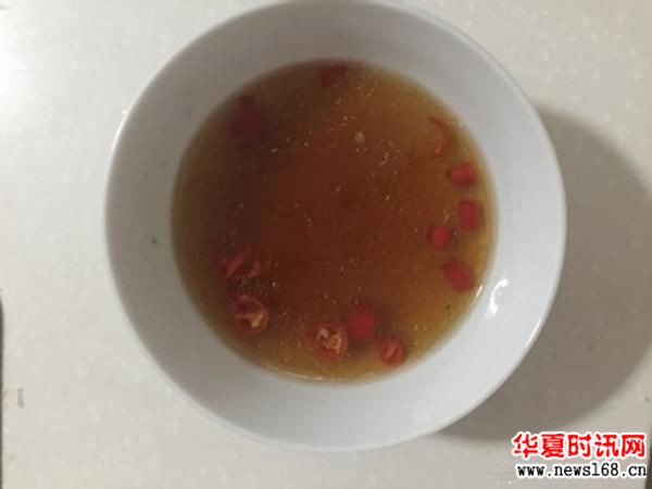 3.乘热从蒸锅中取出,将盘子里蒸出的萝卜汤汁倒入一小碗里,将盐加入热汤汁,使其溶化,然后分别加入蚝油、香油、花椒油,和小米椒辣椒圈搅拌均匀。