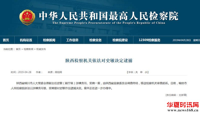 陕西省铜川市人大常委会原副主任史敏被逮捕 新华网 2019-04-29 11:16 官网截图 人民网西安4月28日电(谷妍) 据高检网消息,陕西省铜川市人大常委会原副主任史敏(副厅级)涉嫌贪污、受贿一案,由陕西省监察委员会调查终结,移送检察机关审查起诉。日前,榆 官网截图 人民网西安4月28日电(谷妍) 据高检网消息,陕西省铜川市人大常委会原副主任史敏(副厅级)涉嫌贪污、受贿一案,由陕西省监察委员会调查终结,移送检察机关审查起诉。日前,榆林市人民检察院依法以涉嫌贪污罪、受贿罪对史敏作出逮捕决定。案件正在进一步办理中。