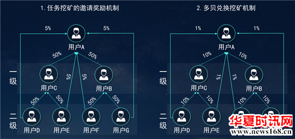 最后就是用户的激励体系了。为了最大的回馈用户,享多多平台内的诸多用户行为,基本都可以获得相应的通宝积分奖励,比如新用户注册、邀请好友注册,浏览新闻和广告、在任务大厅完成各种任务等等。具体而言,奖励机制又细分为任务挖矿奖励机制和多贝兑换奖励机制。