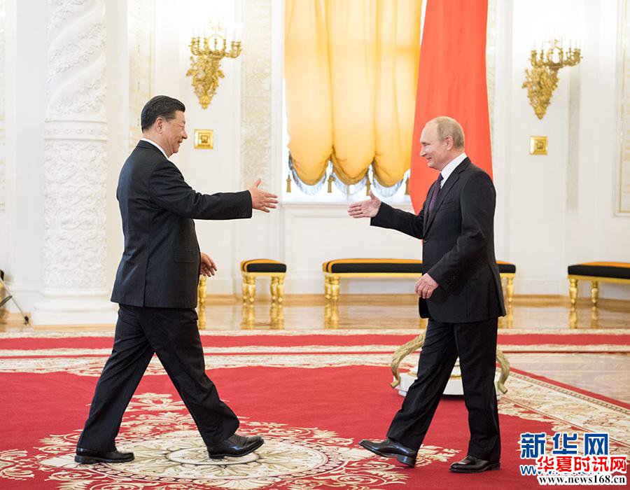 6月5日,国家主席习近平在莫斯科克里姆林宫同俄罗斯总统普京会谈。这是两国元首在会谈前握手。 新华社记者 李学仁 摄