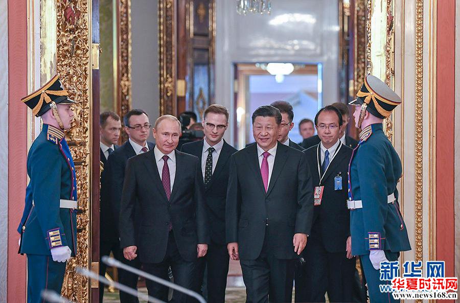 6月5日,国家主席习近平在莫斯科克里姆林宫同俄罗斯总统普京会谈。这是两国元首步入会场。 新华社记者 谢环驰 摄
