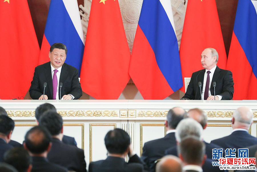 6月5日,国家主席习近平在莫斯科克里姆林宫同俄罗斯总统普京会谈。这是会谈后,两国元首共同会见记者。 新华社记者 姚大伟 摄