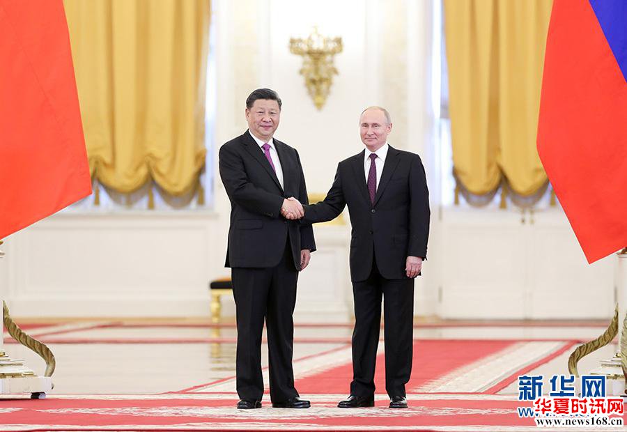 会谈前,普京总统在克里姆林宫乔治大厅为习近平举行隆重欢迎仪式。