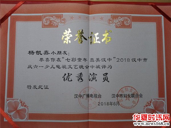 2018年6月在《汉中市庆六一少儿电视文艺晚会》中荣获“优秀演员”称号