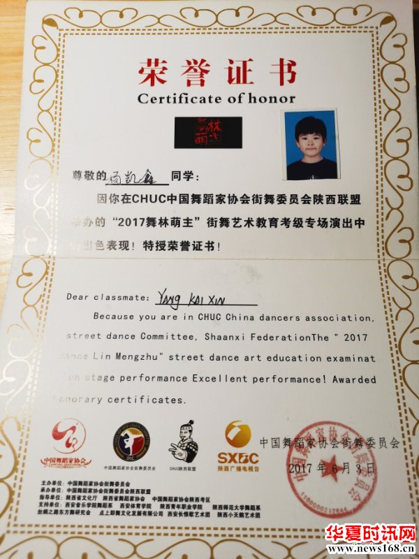 2017年6月获得《中国舞蹈家协会街舞委员会陕西联盟》的“街舞艺术文艺志愿者”称号