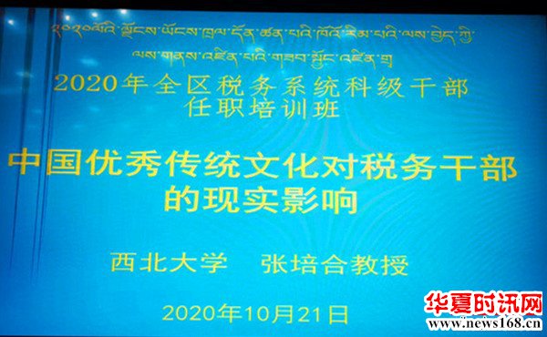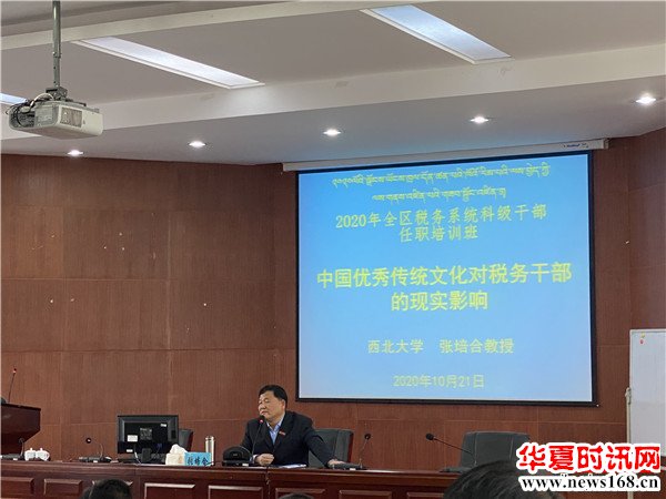同年10月21日,著名文化学者张培合教授受邀来到了海拔3000多米的西藏税务干部学校,为西藏自治区税务系统科级干部进行了独具风格的传统文化培训。张培合教授主讲的题目是《中华优秀传统文化对税务干部的现实影响》,张教授全程脱稿演讲达8小时之久,培训活动秩序井然,活动现场掌声雷动。张培合教授的精彩演讲获得汉藏税务干部们的热烈欢迎和一致好评!张培合教授冒着严寒及严重的高原反应,不辞辛劳,身体力行,知行合一。数年来,张教授在传播中华优秀文化,坚定党政干部文化自信的道路上始终向上向前,这种精神令人感动!据悉本次张培合教授赴西藏税务干部学校做演讲培训长达8个小时开辟了国内文化学者进藏演讲时长最长的第一人。