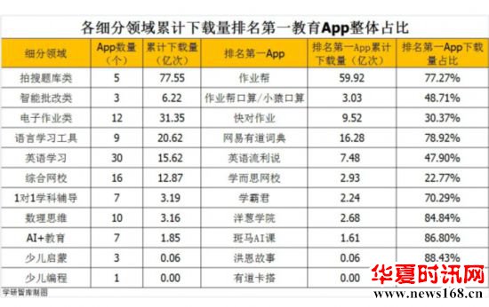 数据显示,截止2020年10月15日,29家K12在线教育机构103款App在国内7大安卓应用平台累计总下载人次为172.5亿次。其中,语言学习类App30款,数量最多;作业答疑题库类工具App 20款,累计下载量115.12亿次,下载量最大,占所有103款App累计下载量的比重为66.74%。