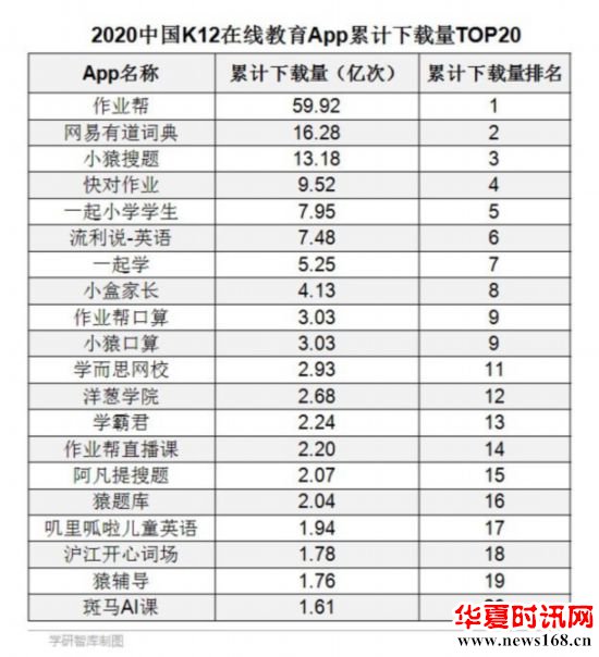 11月23日, 学研智库发布2020中国K12在线教育移动应用下载分析报告。报告显示,在29家中国K12在线教育机构103款App中,作业帮App累计下载量59.92亿次,在“2020中国K12在线教育App累计下载量TOP20“中排名第一,领先第二名数倍,占据流量侧绝对优势。