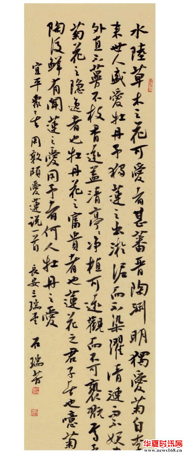 知道瑞芳,是因为先知道她父亲石宪章先生。石先生是当代书法名家,以正大雄强的颜体行楷书为世人推崇。石先生是天津武清人,武清是出过一个颜楷大家华世奎的,我想石先生有可能是受了华世奎的浸染进而喜欢颜鲁公,而后卓然成为一代名家。有一年遇一个书法活动,我竟有幸与石先生临桌在一块儿写字,但见先生浓墨饱蘸,势大力沉,书风豪迈而真气弥漫,令我真是一饱了眼福。那时石先生也搁笔看我写字,并连连击掌称赞,其实那时我初出茅庐,笔怯意涩实难入先生法眼,我想先生的赞赏完全是出于对后学的鼓励与鞭策,也体现了先生宽厚仁爱的长者风度。虽是初次见面,但石先生让我感觉和蔼如故,如沐春风。