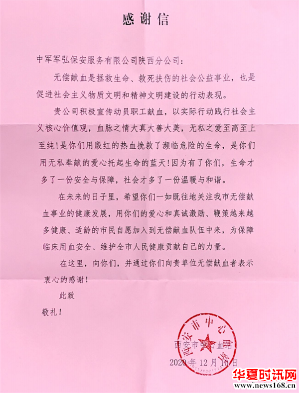 血液,是生命的源泉,是人间传递真情的红色纽带,无偿献血是无私奉献、救死扶伤的崇高行为,是每个公民应尽的责任和义务。为进一步提高中军军弘保安服务有限公司陕西分公司全体员工整体思想觉悟,弘扬奉献社会公益事业精神,树立关心社会服务他人乐于奉献的道德观和价值观,在陕西分公司总经理杨永棋的号召和倡议下,大家踊跃报名,积极参与志愿献血。西部新闻网领衔全国媒体聚焦本次公益献血活动。