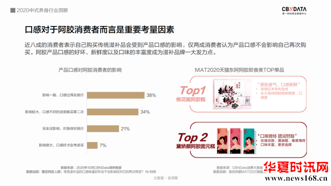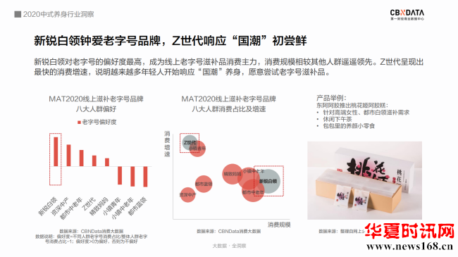 根据CBNData《报告》,“热爱”老字号的消费者中,新锐白领是不折不扣的消费主力,而Z世代消费者贡献了最快的消费增速。作为更喜欢“国潮养身”的群体,年轻一族愿意尝试可以方便快捷食用的老字号产品。如东阿阿胶的桃花姬阿胶糕,就是白领和年轻女性包包里常备的健康小零食。