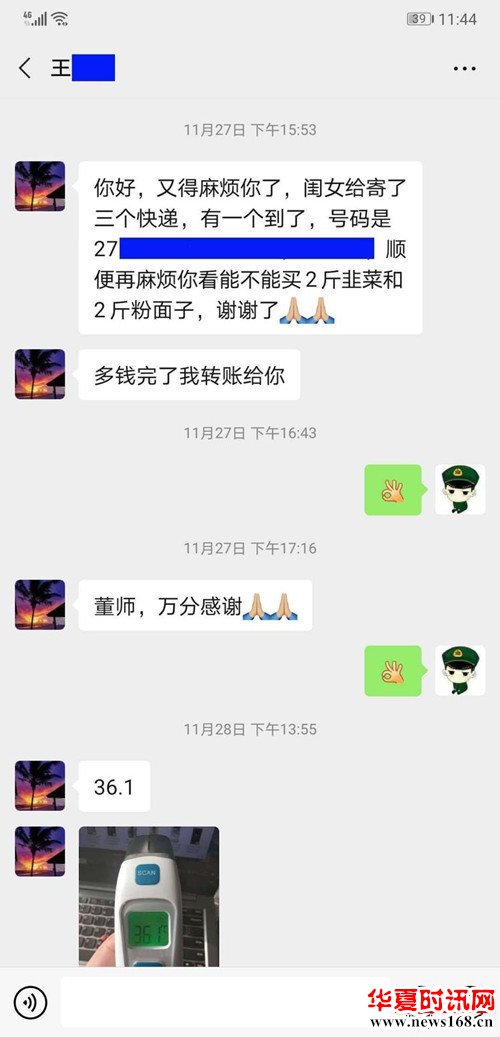 在王先生居家隔离期间,社区包抓干部董伟每天都通过微信视频、电话等方式“一对一”与他保持联系,为他提供代购生活用品、取快递、心理疏导等暖心行动。王先生表示:“自居家隔离之日起,董伟就帮忙买菜、取快递、送体温计,每天询问身体情况,种种不计得失的关心和付出,让我感受到了亲人般的温暖。”