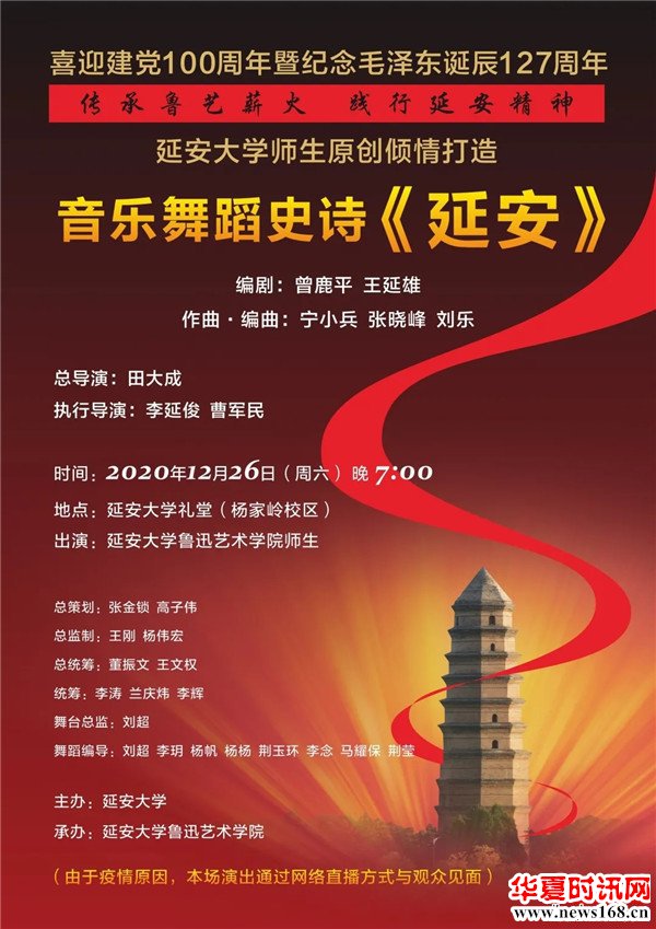 2020年12月26日晚7:00,由延安大学师生原创倾情打造的音乐舞蹈史诗《延安》将在延安大学大礼堂(杨家岭校区)举行首演。由于疫情原因,本场演出通过网络直播方式与观众见面。