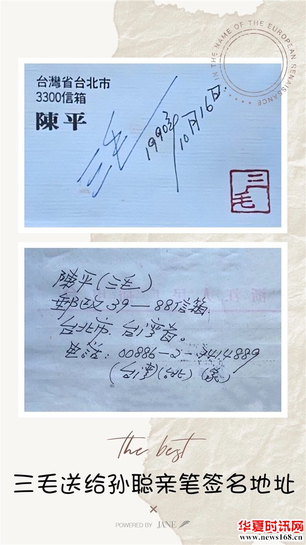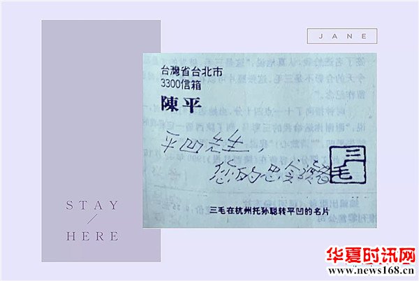 临走她送我一张她的照片,说披发的是三毛,现在的合影只能留作纪念,并签名给我。又送了她的名片给平凹先生,专门写了一句话:“平凹先生,您的忠实读者——三毛”和详细通讯地址及电话