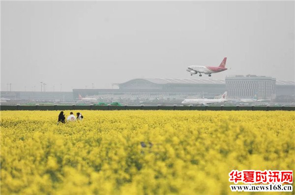 碧空花海,空港芸田。每隔三分钟就有西安咸阳机场起降的飞机从万亩油菜花海上空掠过,跑道外就是万亩油菜花海,人、花海、巨大的飞机同框,一幅幅令人遐想的碧空美学画卷已然呈现在眼前,同时“鹰击长空”般的轰鸣声似乎为这张唯美的画卷加上了动力引擎。