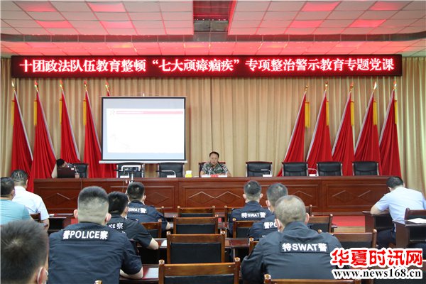 华夏时讯网 (陈青云) 5月10日下午,十团党委常委、政法委书记、人武部长郑宏伟在机关四楼为全团政法干警讲授“七大顽瘴痼疾”专项整治教育专题党课。