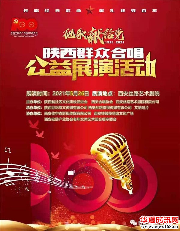 为庆祝中国共产党成立100周年,5月26日下午,在西安丝路艺术剧院成功举办“把歌献给党”群众合唱公益展演。此次展演是由陕西省社区文化建设促进会、西安合唱协会、西安丝路艺术剧院有限公司联合主办,由陕西世纪凯文传媒有限公司、西安世纪丝路影视传媒有限公司、艾纳唱片共同承办的大型群众文化活动。整场活动主题突出,“传唱经典红歌,献礼建党百年”。