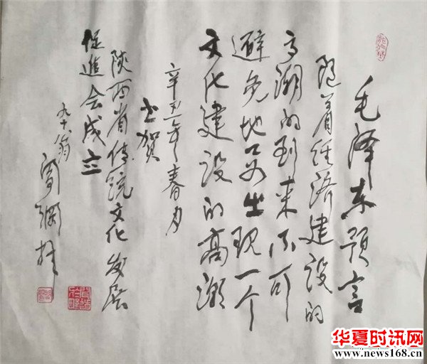 全国著名评论家、国务院有特殊贡献专家阎纲,中国民协副主席、陕西省文联副主席王勇超,陕西省广播电影电视厅原党组书记、厅长骞国政,陕西电视台原台长王超,为陕西省传统文化发展促进会成立大会赠送了书法作品。(李秋颖 摄影/寇蓬者、成永杰、黄武涛)