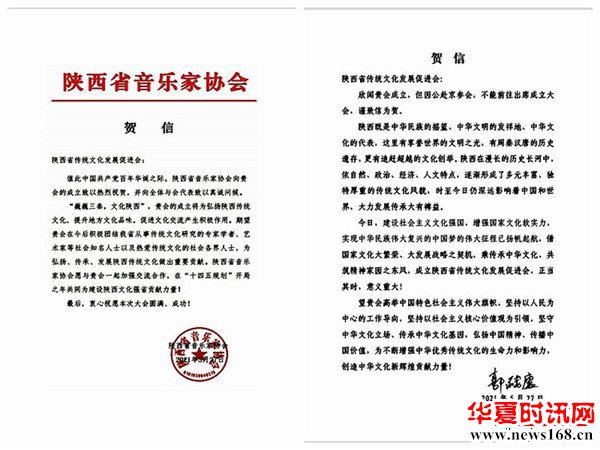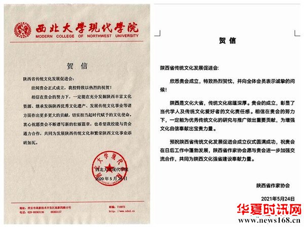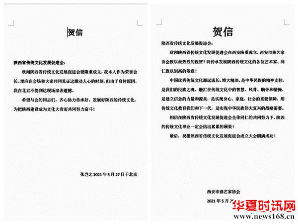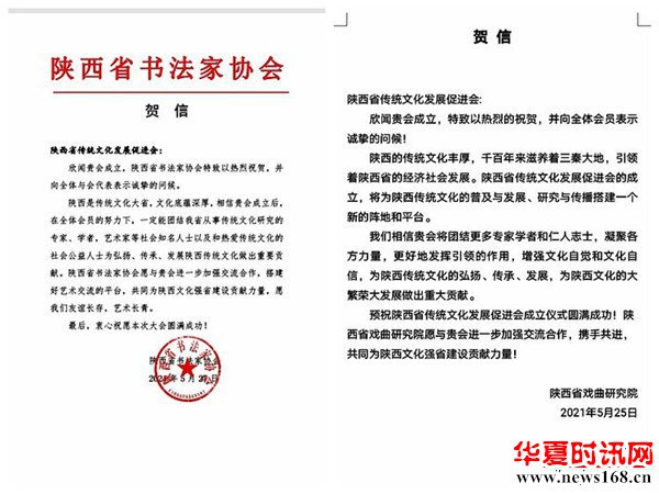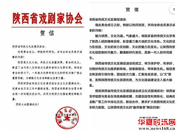 本次陕西省传统文化发展促进会成立大会,引起社会的广泛关注,历史学家、思想史家张岂之,中国美协理事、陕西省美协主席郭线庐等为大会发来贺信。陕西省作协、陕西省剧协、陕西省戏曲研究院、陕西省美协、陕西省书协、陕西省图书馆、西安市曲艺家协会、西北大学现代学院、陕西省歌舞剧院等单位发来贺信贺电,对陕西省传统文化发展促进会的成立表示热烈的祝贺。