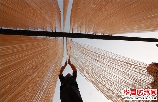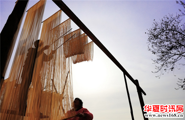 顺一圈绞一圈,再顺一圈再绞一圈,比城里人缠毛线熟练多了,好看多了。上完签,短短的一挂一挂放进胡基仓子里,用草帘捂严,朝上面洒水,以密封的潮湿使盐溶尽,将面醒到位。人是离不得的,时不时得抻抻、分分、分分、抻抻。翌晨日上三竿,院里的椿树枝将影子图案般印在北屋暖融融的南墙上。星儿一觉醒来,家里的大人已经忙了一大早,院里奇迹挂满了一签一签挂面,像一幅幅浆洗得白白净的半透明的纱,在微风中摇曳,在阳光下抻长。