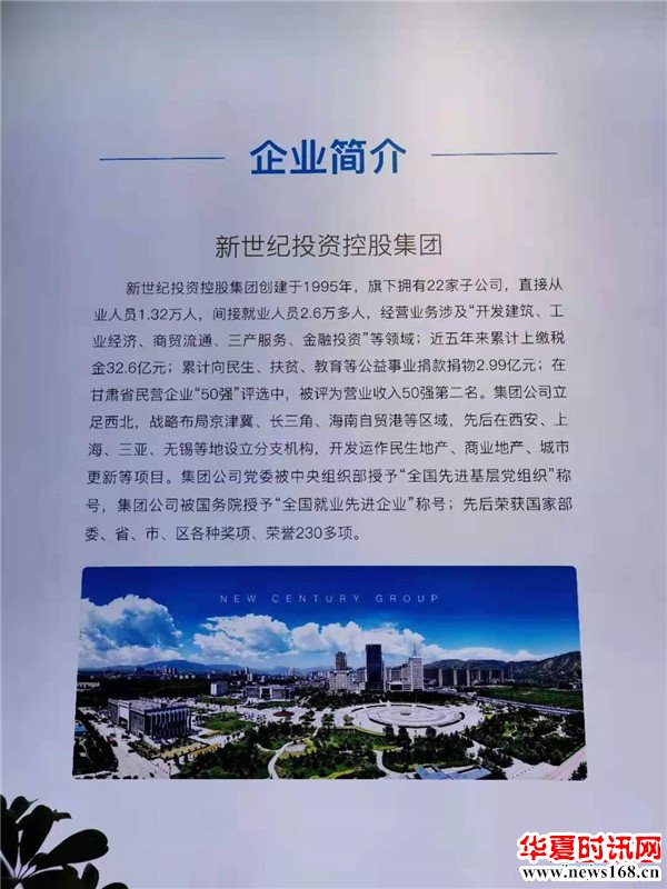 甘肃省新世纪投资控股集团有限责任公司创建于1995年,旗下拥有22家子公司,直接从业人员1.32万人,间接就业人员2.6万多人,经营业务涉及“开发建筑、工业经济、商贸流通、三产服务、金融投资”等领域;近五年来上缴税金32.6亿元;累计向民生、扶贫、教育等公益事业捐款捐物2.99亿元;在甘肃省民营企业“50强”评选中,被评为营业收入50强第二名。集团公司党委被中央组织部授予“全国先进基层党组织”称号,集团公司被国务院授予“全国就业先进企业”称号;先后荣获国家部委、省、市、区各种奖项、荣誉230多项。