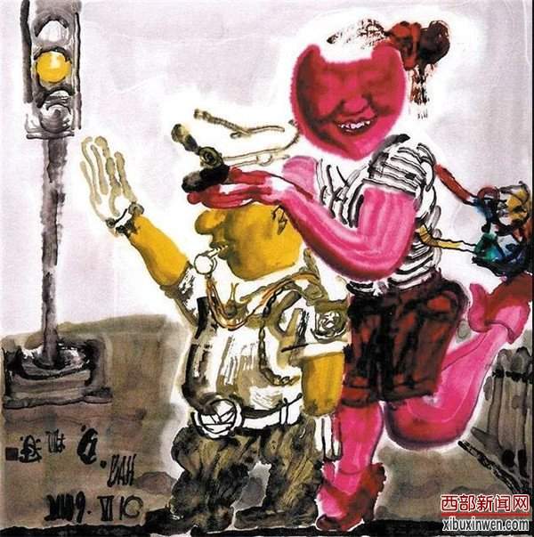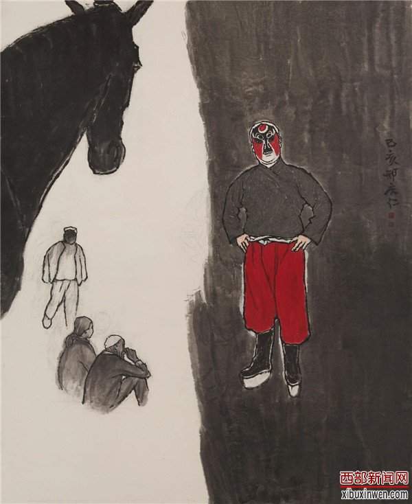 他的画作传承了中国绘画优秀的传统笔墨与技法,又融合了浙派人物明快秀润、浑厚华滋、元气淋漓的写意精神与“长安画派”古雅稚拙、苍厚朴茂、构思巧妙、关注众生、生活气息浓郁的纪实风格。在他的意笔人物画中也若隐若现着一些“现代”乃至“前卫”的元素,如西方现代艺术的形式构成、夸张变形、西画中的斑驳陆离的光影、透视等等。尤其难能可贵的是,他已不再满足于浅表层象的直观表达,而是将笔触更多地深入当下社会芸芸众生的灵魂深处,更多地表达人们的内心世界与精神诉求,多了一重人文精神与人道关怀,画作的内涵厚重丰富了,也就更具有了人文价值与实验意义。