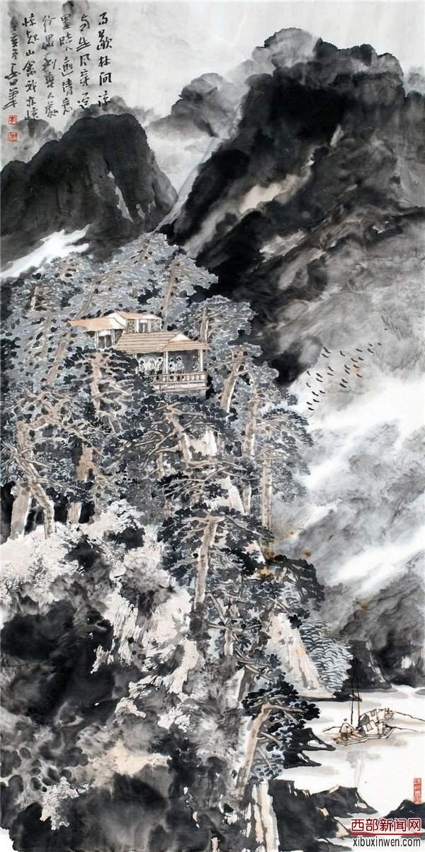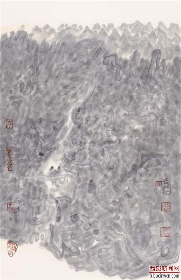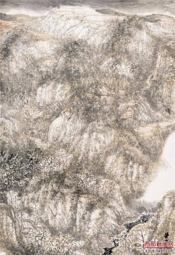 他的国画多以书法草隶线条入画构成山石坚硬、刚毅的样式,用泼墨、积墨方式造成秦岭山川厚重与扎实的画面效果。画面中的留白与墨、色皴染的浓淡契合形成光感,对北方昆仑、祁连、秦岭等山脉的云烟、雾岚做了恰到好处的笔墨交代。由此呈现了秦岭等北方山水,雄伟遒劲中又略显悲凉寂静、空灵神秘的氛围,从而在对人与苍茫山水的对比、与自然亘古的对比中呈现人的渺小和自然的久远,同时也反映了人的精神世界与自然万物、浩瀚宇宙三位一体的中国传统审美与哲学。