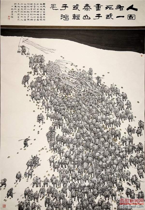 作为黄土画派的中坚力量和代表画家之一,他数十年如一日描绘陕西农民的生存状态,用画笔传递中国传统文化和黄土风情,他将绘画创作扎根于黄土之上枝繁叶茂,将生命与灵魂附着于黄土之上生机蓬勃。通过学院艺术与民族、民间艺术有机结合,他创造了属于自己的艺术风格和笔墨语言。他的作品虽然是随着西方绘画的潮流而趋动,但中国画的传统的河床却在潜藏着,如堆塔直上乃成高,如疏水远源方成流。他画的大小繁简,大多用墨粗野,气是向外激射的,而不是紧缩的,如同在平和中显秦雄,在敦厚中见幽默,好有些若拙的大巧,恰恰体现了关中的风度。而这浓郁的秦风秦韵,质朴的风土民俗以及多方位的艺术探索构成了鲜明的、别具一格的艺术特色。他是一位将绘画创作植根于黄土地上的“家园守望”者,是一位将艺术眼光放在中国当代艺术发展大命题上的艺术家,是一位将教书育人、传道授业作为终生职业的老师。毫无疑问,他是当今陕西画坛与画派风格最为契合的艺术家之一。
