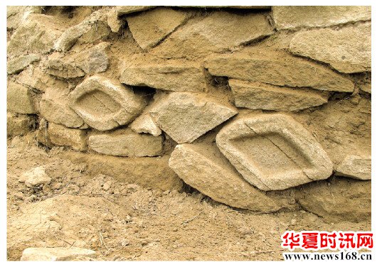 石峁古城的墙体发现的菱形石雕眼纹(2015年9月8日摄)。新华社记者冯国摄