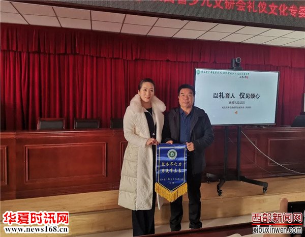 最后,陕西省少年儿童文化研究会礼仪专委会主任任清芳代表研究会,为柞水县营盘镇九年制学校王家富校长进行爱心授旗并为全校学生捐赠《童车马》儿童动漫少儿画刊500份。