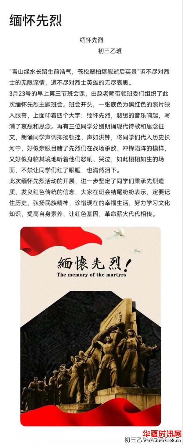 学校向同学们发出倡议,号召大家用安全、节俭、绿色的方式去缅怀先烈,进一步传播文明祭祀新风尚。同学们纷纷通过网络平台,向革命先烈学习,进行文明网上祭英烈活动。