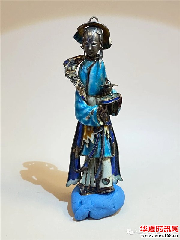 产地福建,通体银胎烧蓝工艺,仕女手捧爵杯,人物造型生动。内藏针筒,拉开可实用,闭和即可悬挂配带,为女红专用之物。