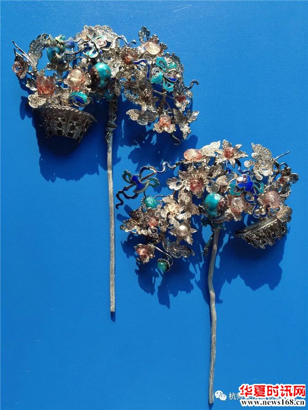 此对簪采用造型复杂的累丝烧篮工艺,配以珍珠、琉璃、碧玺等宝石,造型精美绝伦,为清代浙南福建一带大户人家女子出嫁之物。