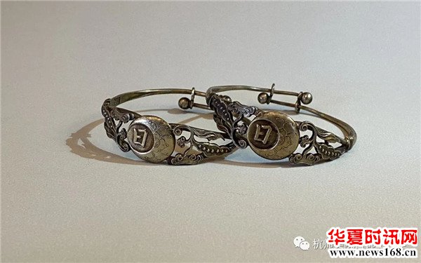 手镯银质鎏金,採用镂空模压工艺制作,有意思的"日"字採用字体,而"月"以月亮的外型来表示,纹样造型灵巧优美,是典型的小姐出嫁之物。