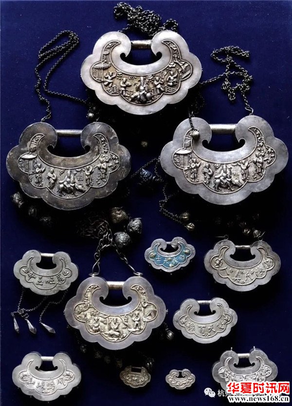 清末民国福建莆田一带长命锁,锁型优美如云,常见"老子出关"、"状元游街"及道佛题材,银工多以鎏金、烧蓝、模压为主。