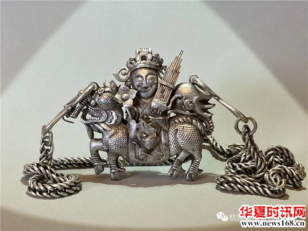 银质高浮雕,造型生动传神,应为童帽坠饰。清至民国童帽花样百出丰富多彩,银饰与女红相配更是锦上添花。
