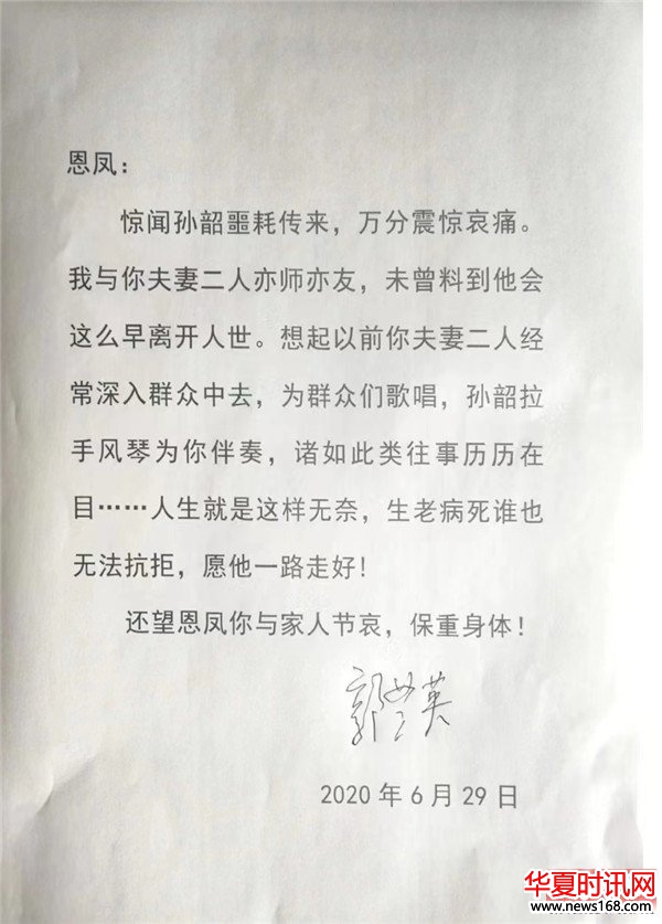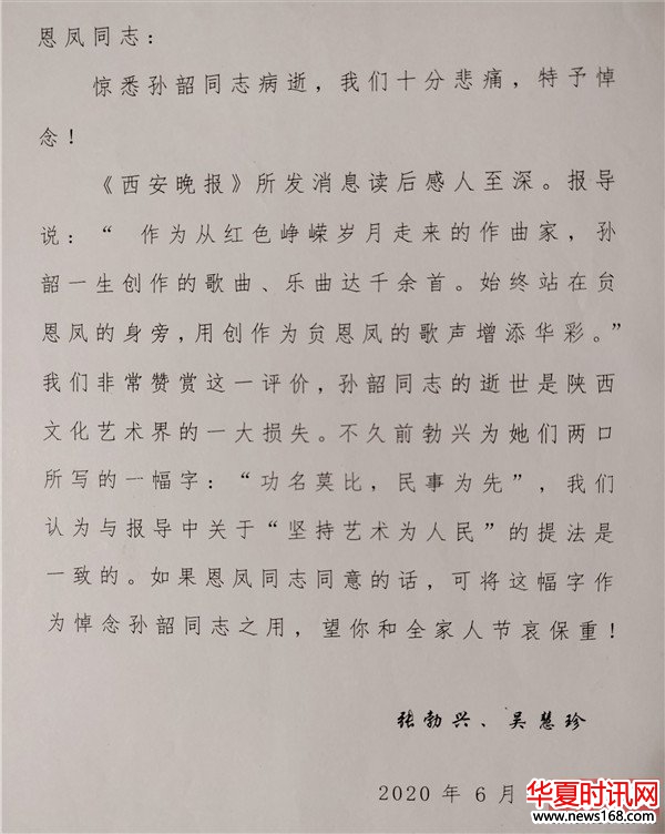 2020年6月29日,孙韶同志溘然仙逝,享年86岁。时光匆遽,转瞬三载,常念先生音容笑貌。孙韶同志从事文艺工作70余年,在任陕西省广播电视民族乐团团长期间,坚持以优秀的文艺作品深入基层,为人民演出,为时代放歌,为乐团跻身国内一流乐团做出了重要贡献。