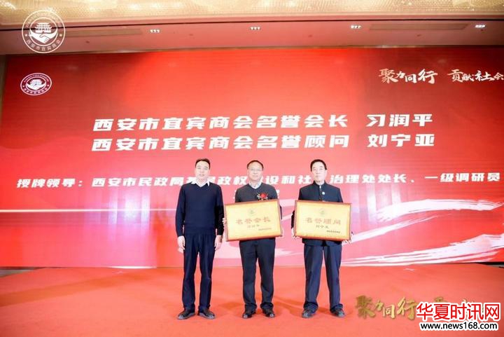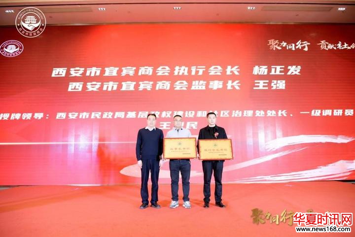 西安市民政局基层政权建设和社区治理处处长、一级调研员王卫民为西安市宜宾商会执行会长杨正发,监事长王强;名誉会长习润平,名誉顾问刘宁亚进行授牌。