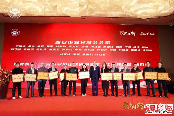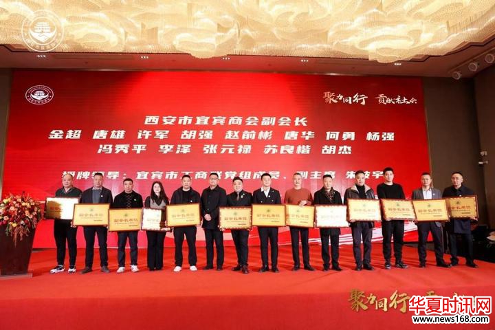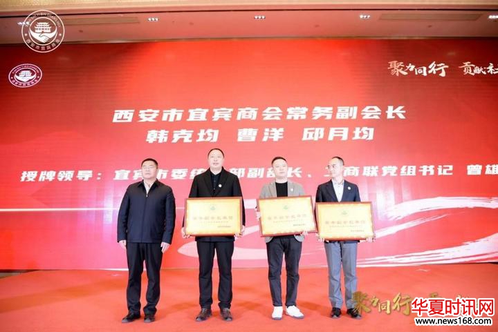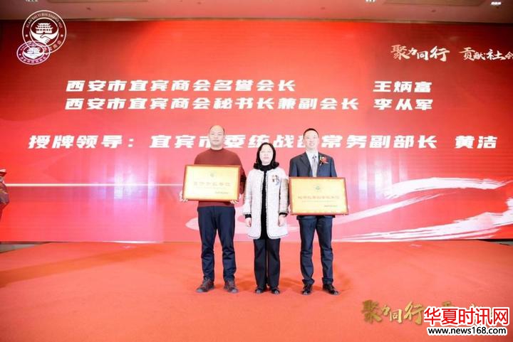 宜宾市委统战部常务副部长黄洁为西安市宜宾商会名誉会长王炳富,秘书长兼副会长李从军授牌。