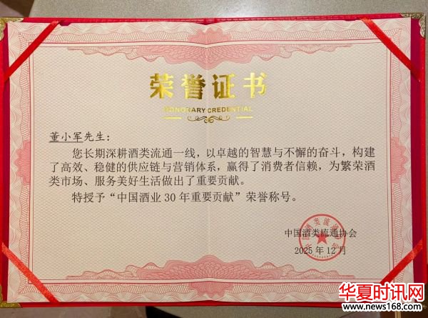 在备受瞩目的荣誉表彰环节,华山论剑西凤酒迎来高光时刻,公司董事长董小军因其对酒业发展的突出贡献,被授予“中国酒业30年重要贡献人物”称号。多年来,董小军董事长带领团队厚植家国情怀,恪守西凤酒千年古法酿造技艺,守护凤香型白酒的独特风味与品质根基;通过文化峰会等系列文化活动与慈善公益践行,让华山论剑西凤酒成为传递中华文化的重要载体,在推动白酒产业发展的同时,践行着民族品牌的责任与担当。